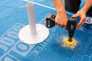 To prepare, cut through the Pro Clima Solitex Adhero layer and CLT base where the drain will go. Keep the area clean, dry, and grease-free for a strong seal.