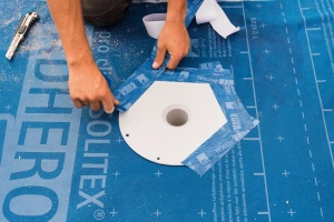 When the project is near completion and the floor drain needs to be removed, cut the tape, lift the drain, and patch the hole with Solitex Adhero sealed with Tescon Vana tape.