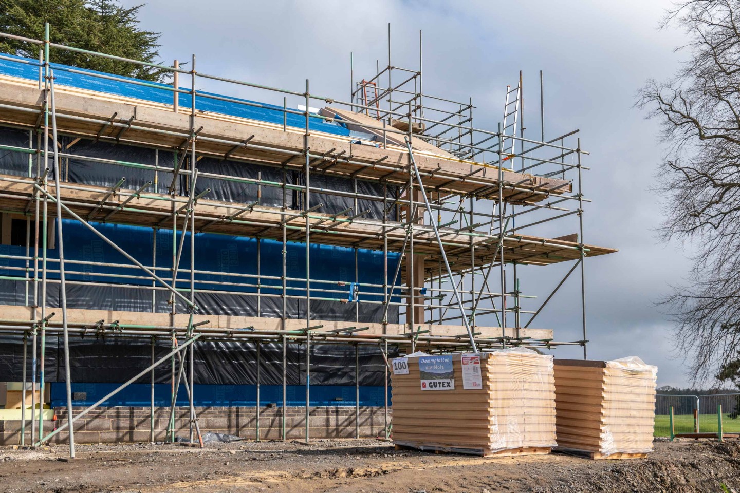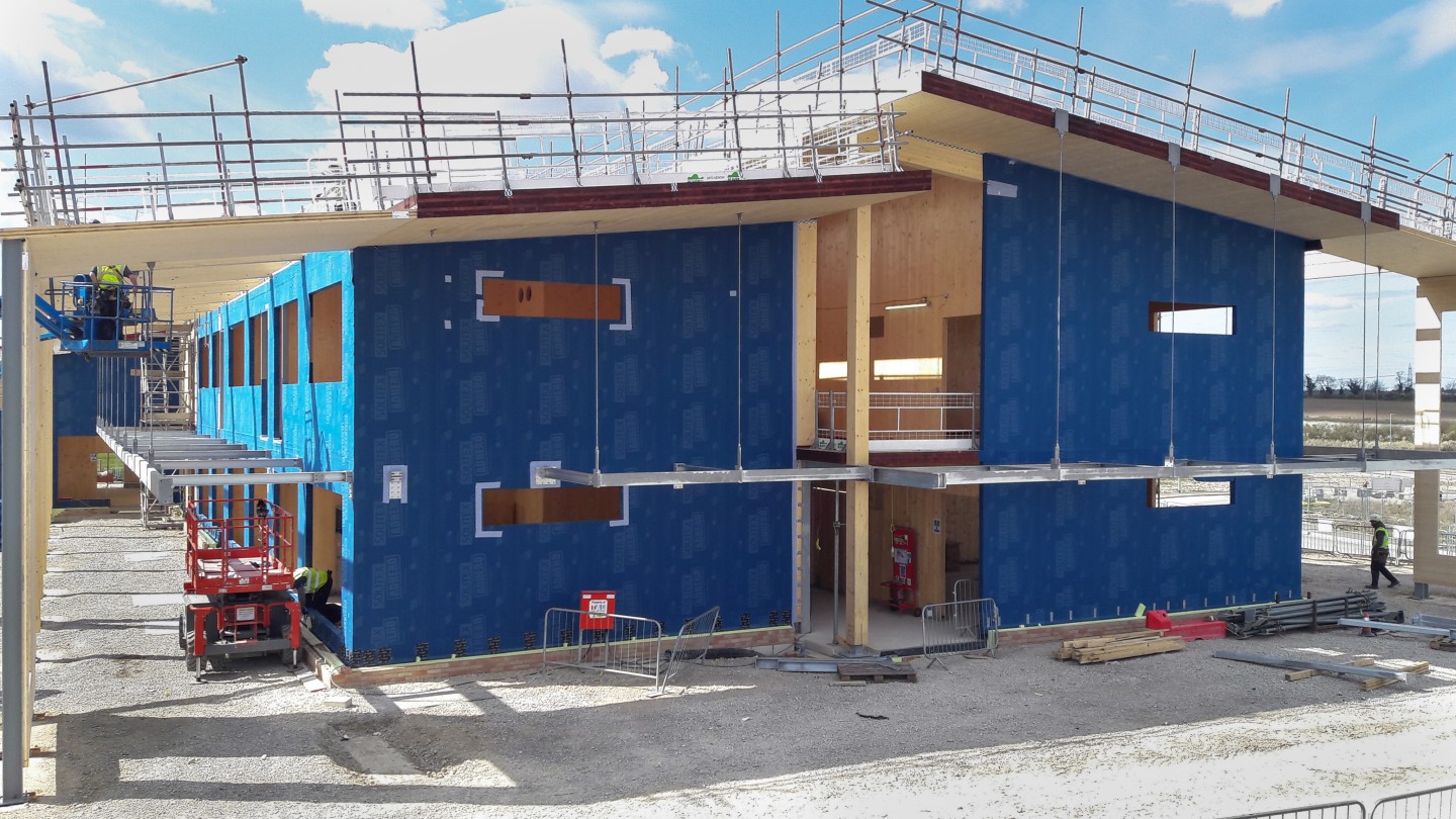The external insulation is made windtight with a Pro Clima external breather membrane and airtight tape. Vertical battens are then fixed with Heco structural woodscrews that go through the batten, woodfibre boards and then into the CLT. The system is then finished with cladding.