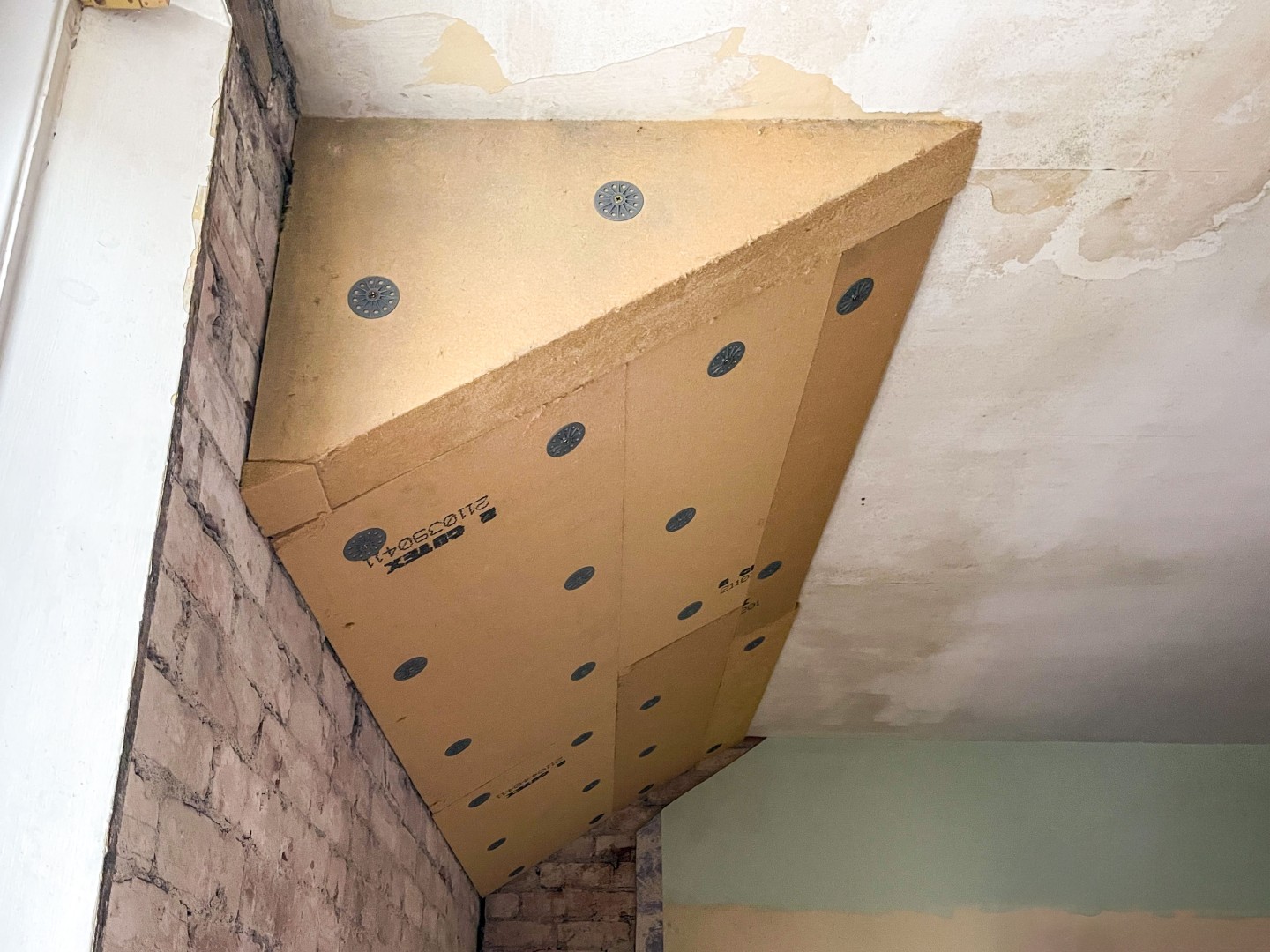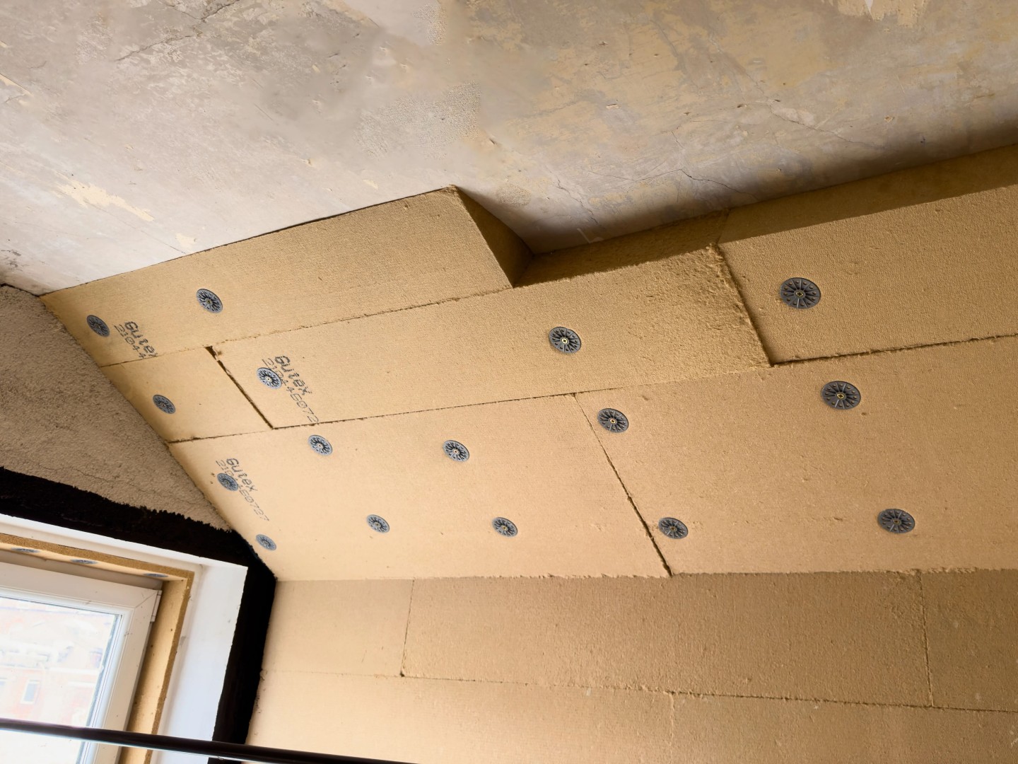 The boards can be fixed directly to existing lime plaster sloping ceilings or, where plaster has been removed exposing rafters, a 25mm wood wool board such as Cewood or Celenit can be installed to the rafters followed by Gutex Thermoroom. The Thermoroom is secured to the rafters in both cases using approved thermally broken mechanical fixings. E.g. Fischer TermoFix 6H-NT.