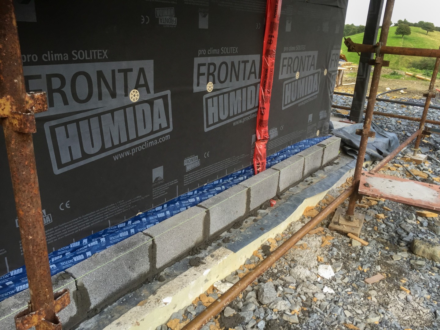 - Pro Clima Solitex Fronta Humida with overlaps sealed with Pro Clima Tescon Vana airtight tape
